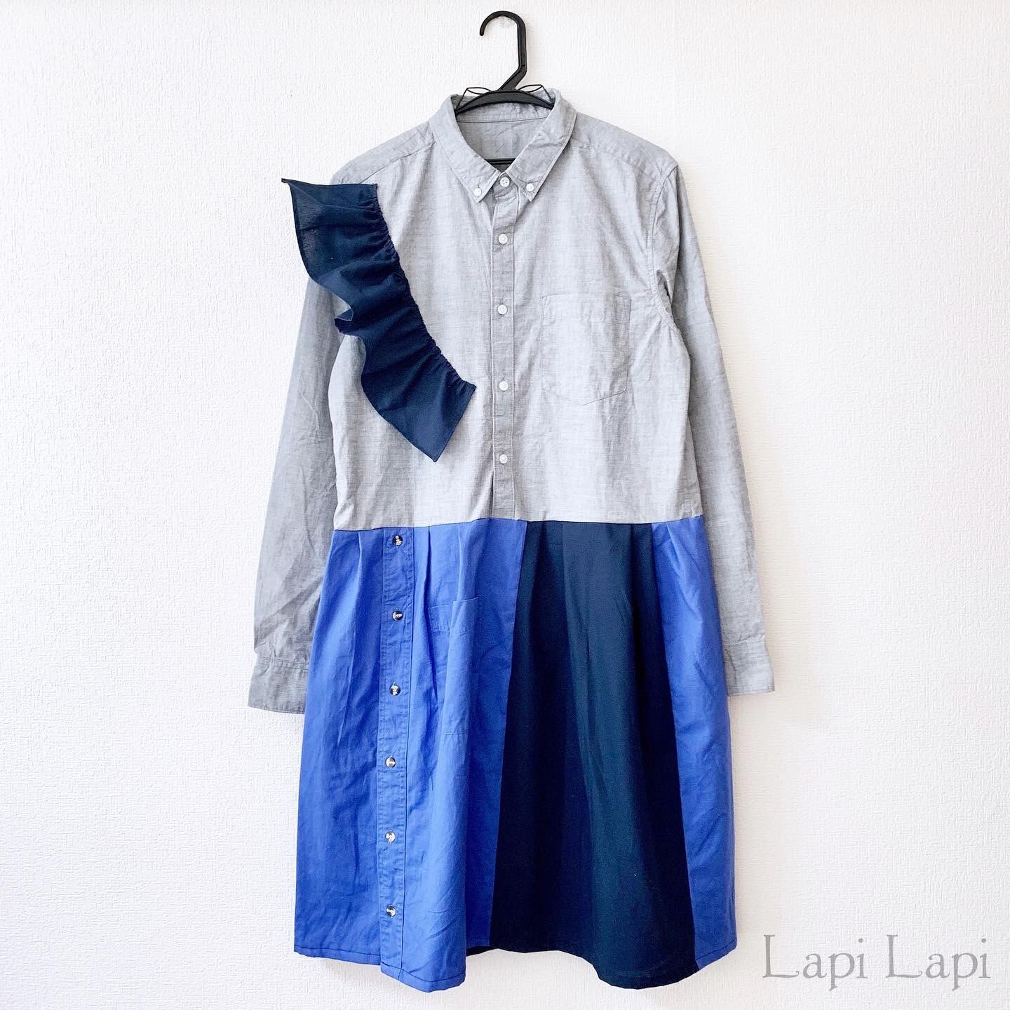 斜めについたフリルとメンズシャツを組み合わせたスカートが印象的なオリジナルワンピース。