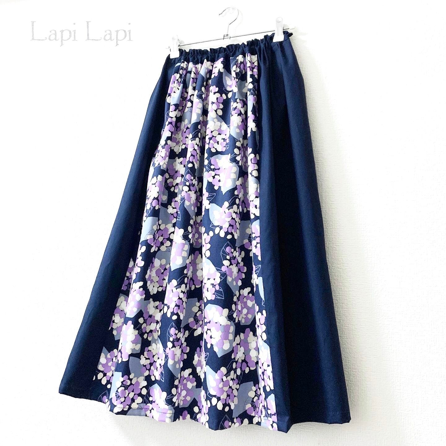 たっぷりのタックとウエスとのギャザーでゆったり着用できるフリーサイズのスカートはここだけの一点物です☆