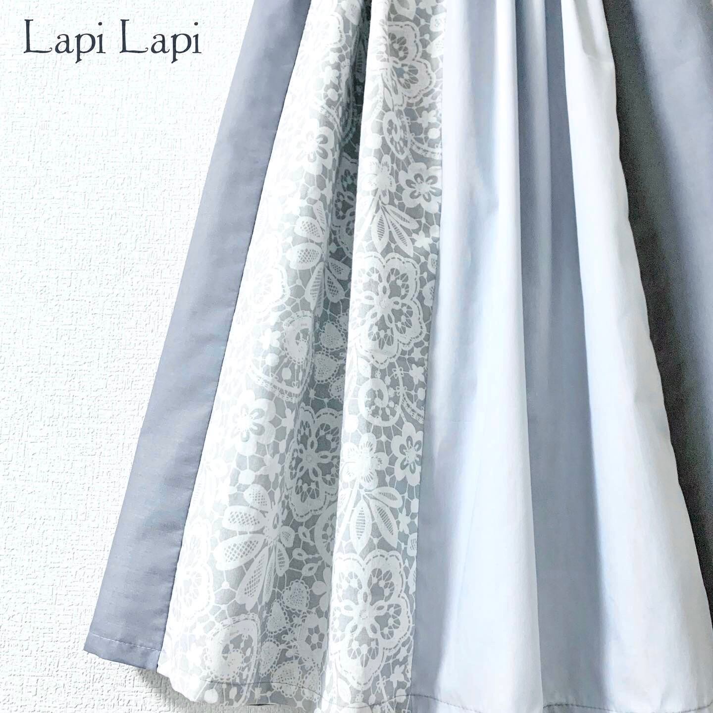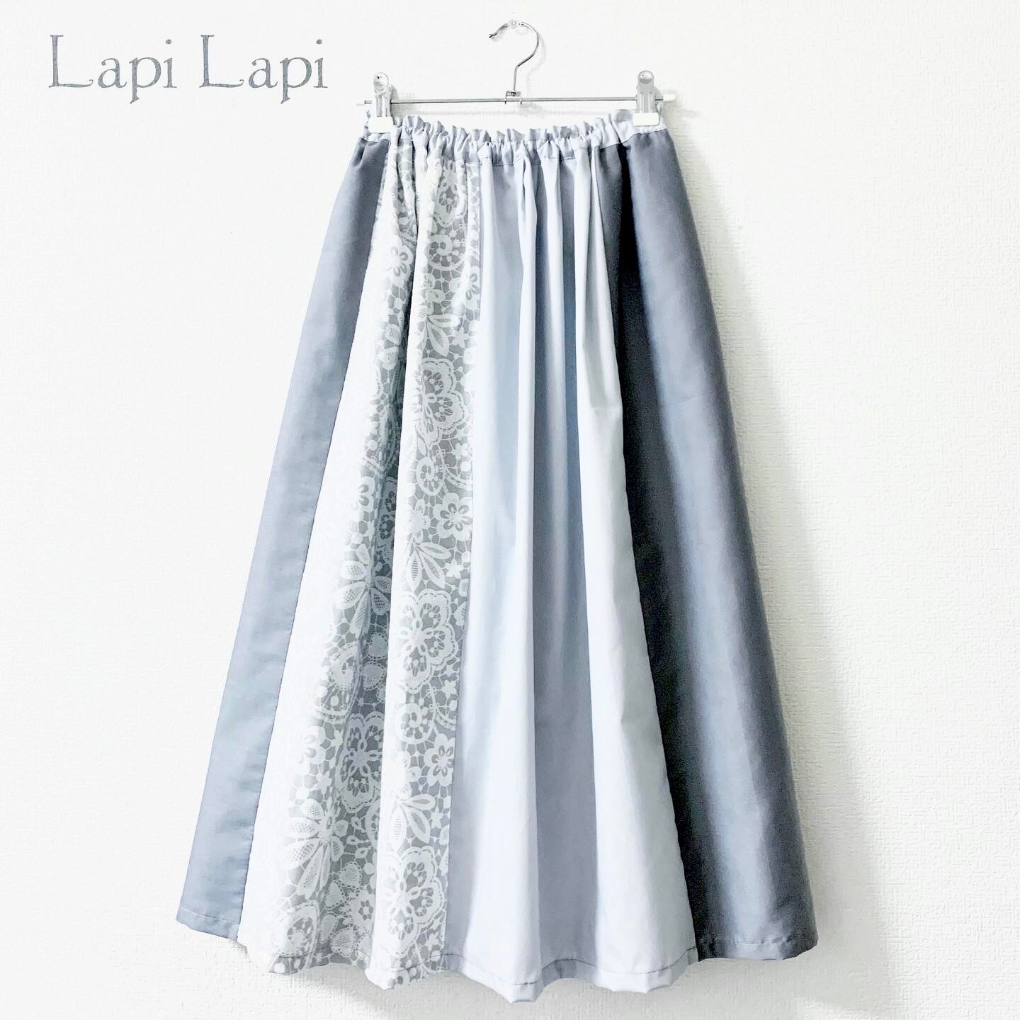 少しずつ色味の違うグレーの生地と、レース柄の生地を組み合わせた一点物の商品でございます。