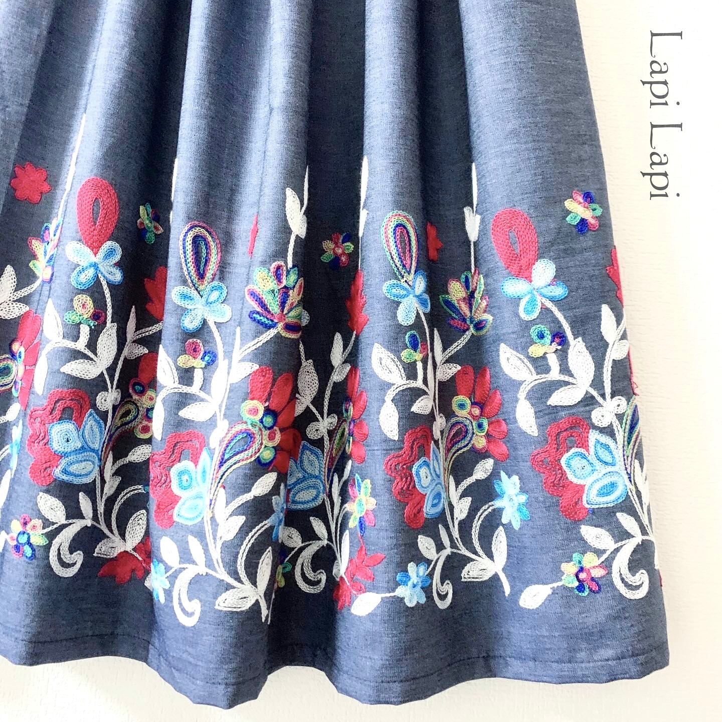 チェーン刺繍の花柄が美しいデニムのギャザースカート