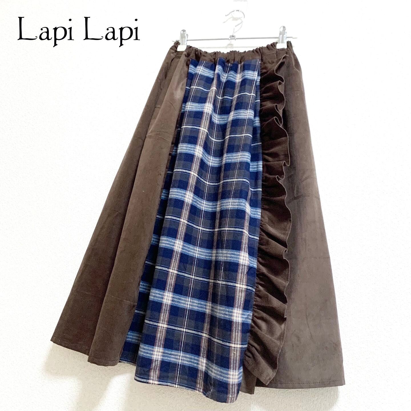 【一点物】コーデュロイ チェックmixギャザースカート ブラウン