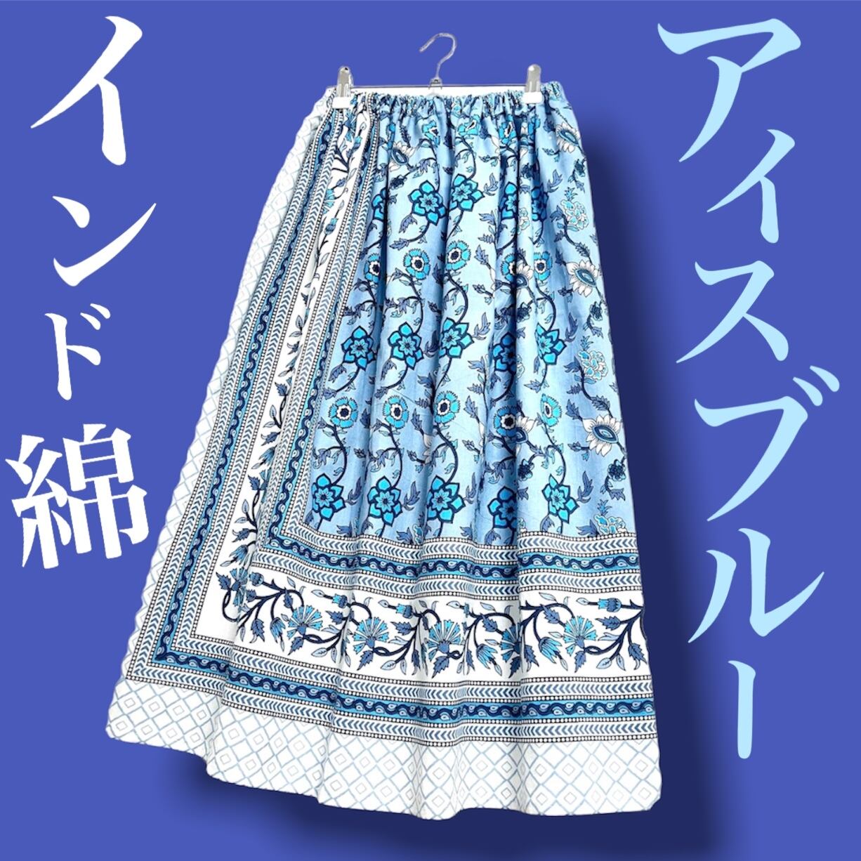 【新作】インド綿ギャザースカート アイスブルー